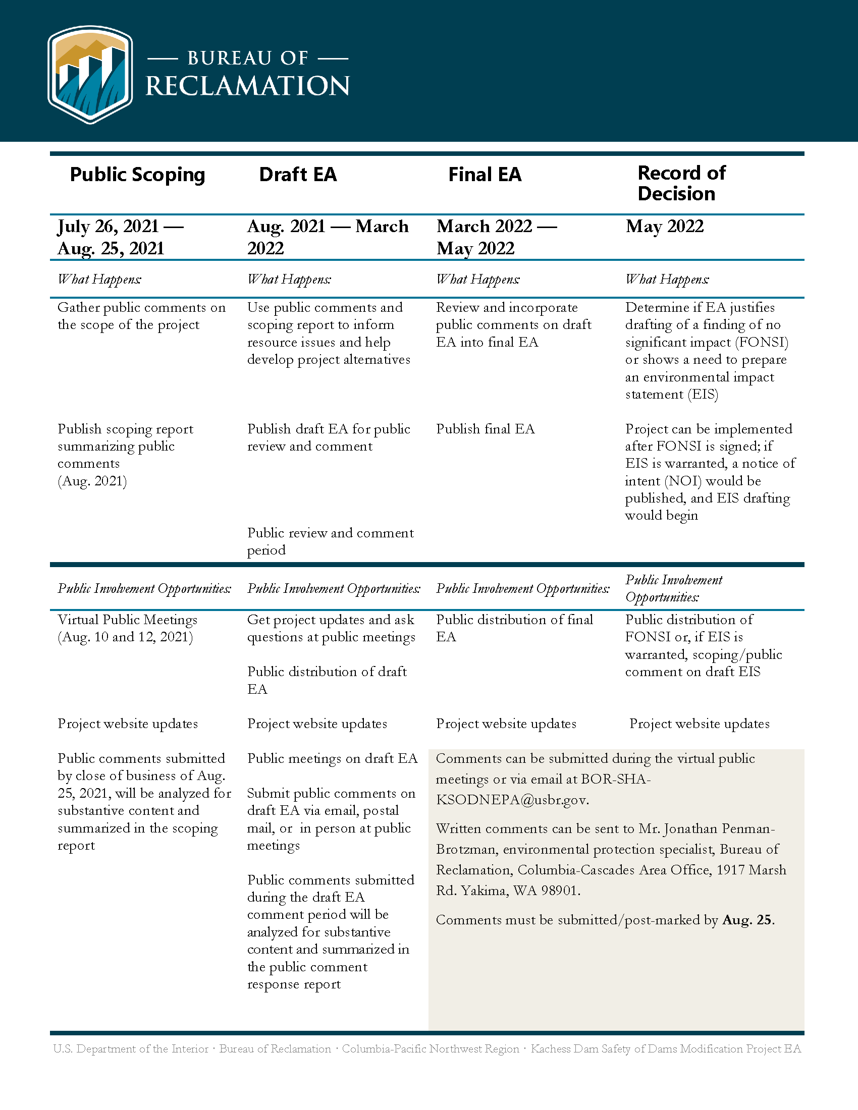For more information on the Kachess Dam Safety of Dams modification project environmental assessment, please contact Jonathan Penman-Brotzman, Environmental Protection Specialist (BOR-SHA-KSODNEPA@usbr.gov).