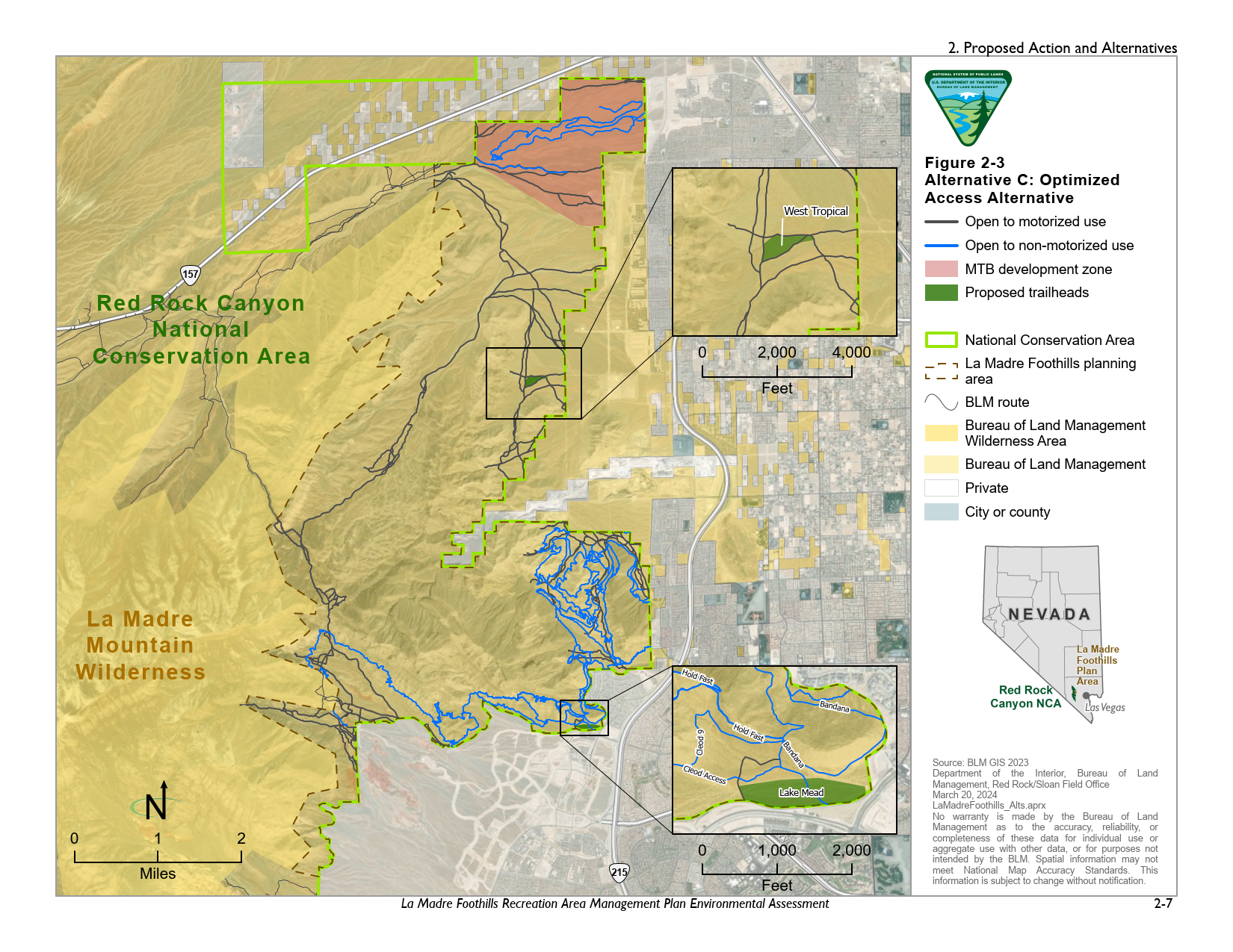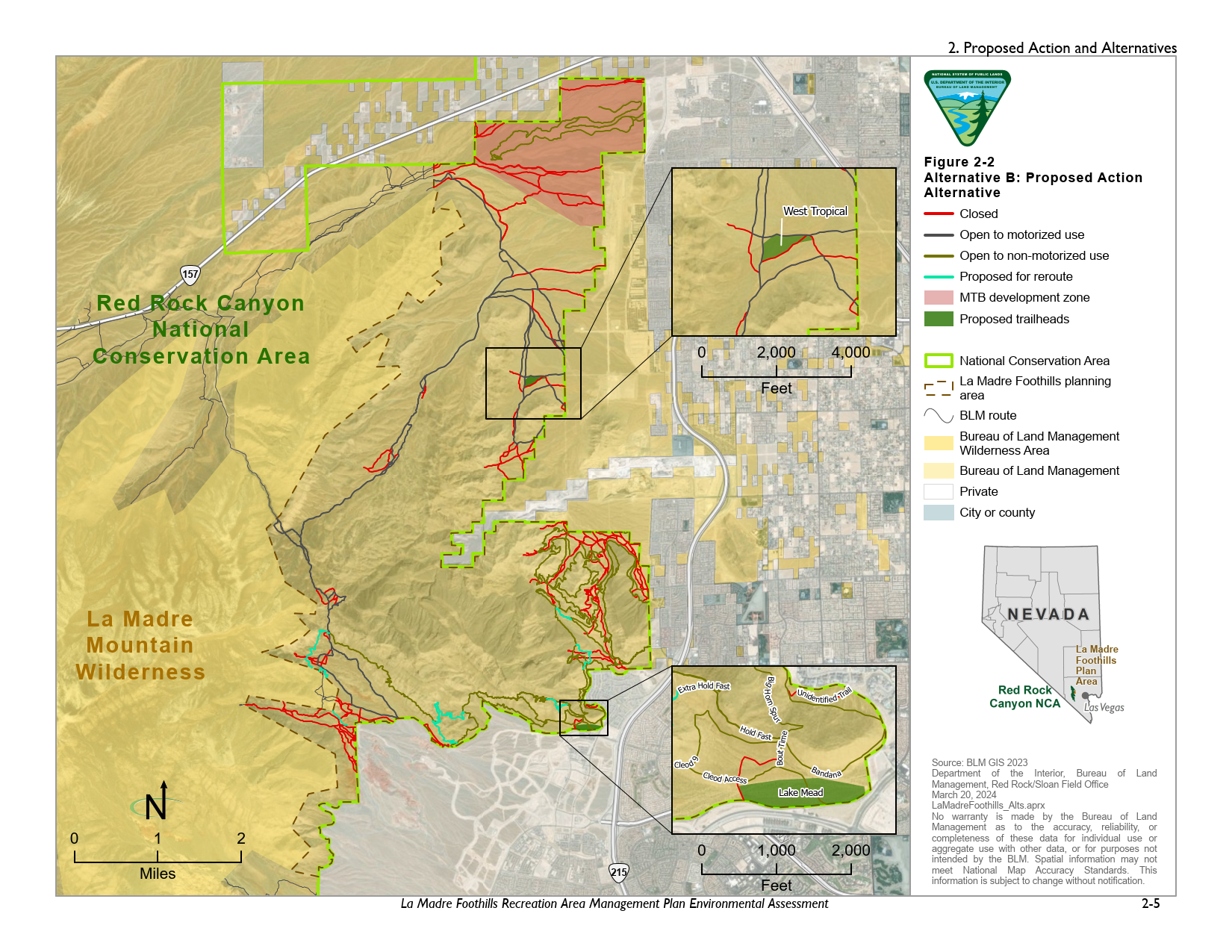 The La Madre Foothills RAMP will help the BLM to establish the vision, objectives, and goals that will identify the appropriate travel network in the La Madre Foothills area within the RRCNCA and to balance current and future recreational use with the resource protection mandate of RRCNCA. The RAMP will also address issues related to unauthorized dumping, target shooting, and unsanctioned trail development.
