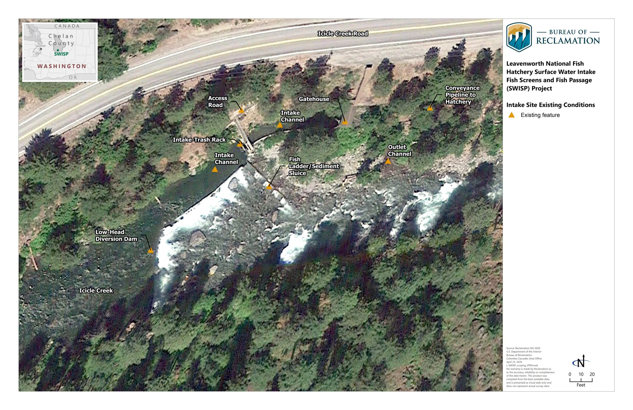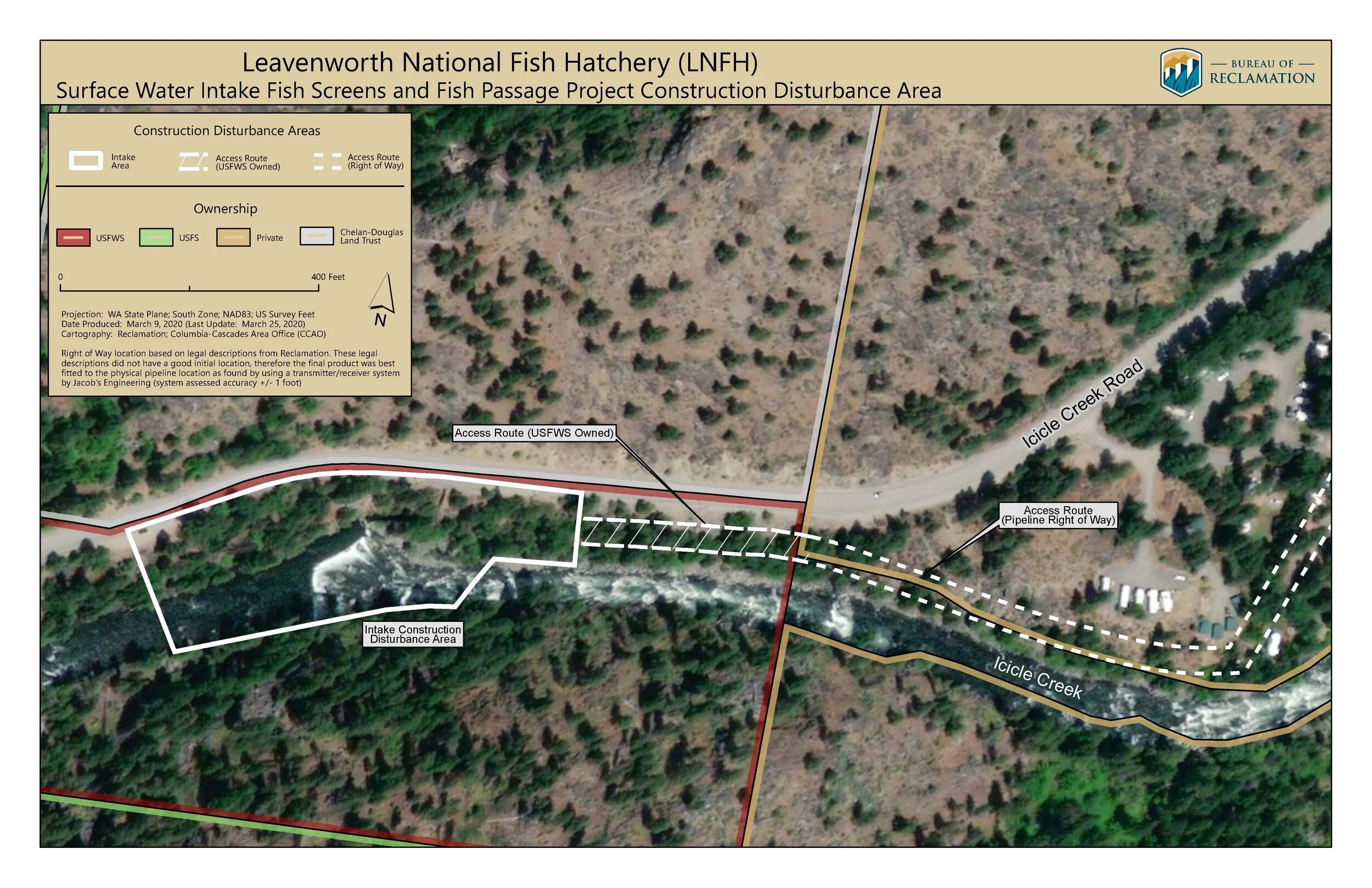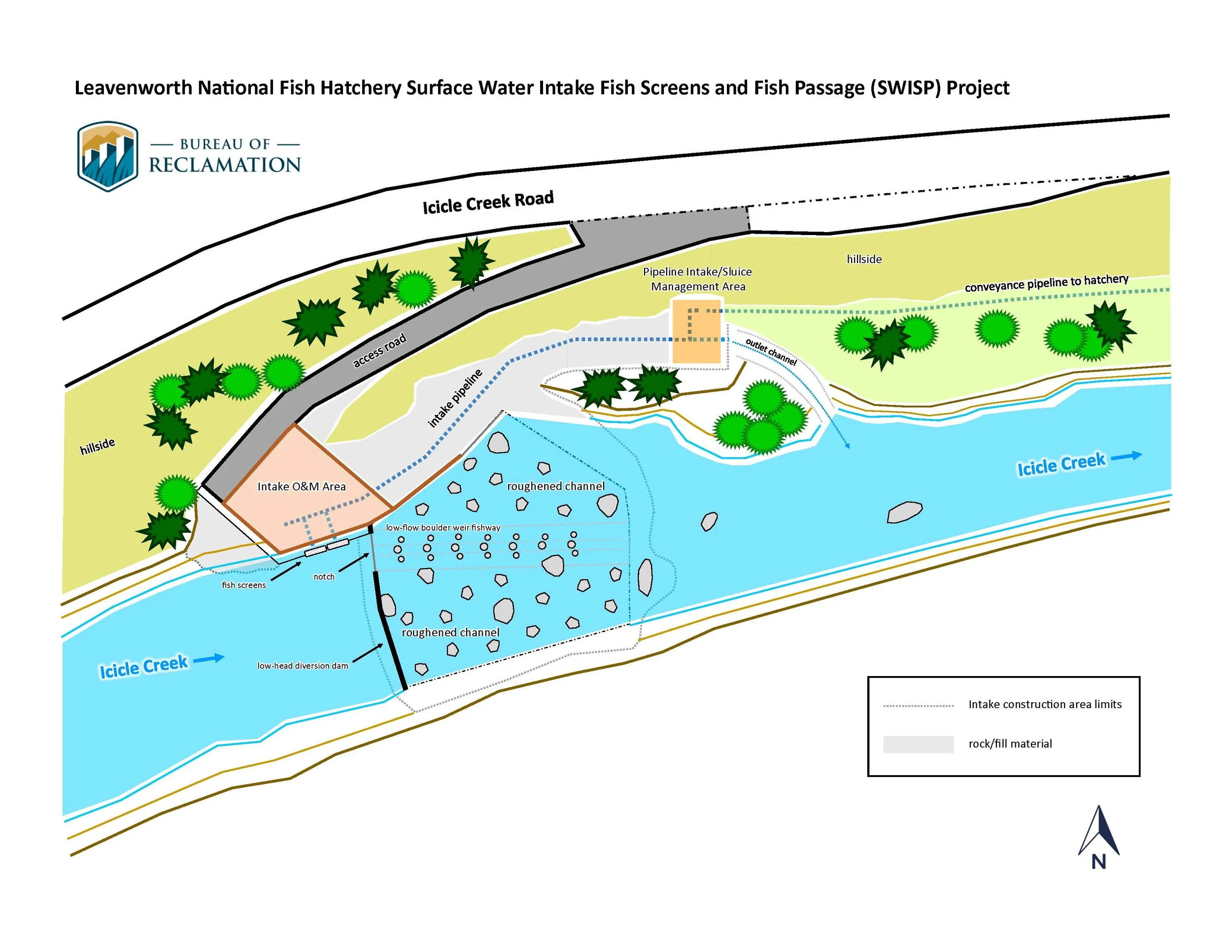 Reclamation proposes to rehabilitate the LNFH intake and delivery system on Icicle Creek by constructing new headworks and a creek-width, roughened channel, as well as replacing/lining the surface water conveyance pipeline to the hatchery. In addition, the current intake access road would be modified and extended to provide better entry to an expanded intake operations and maintenance area.