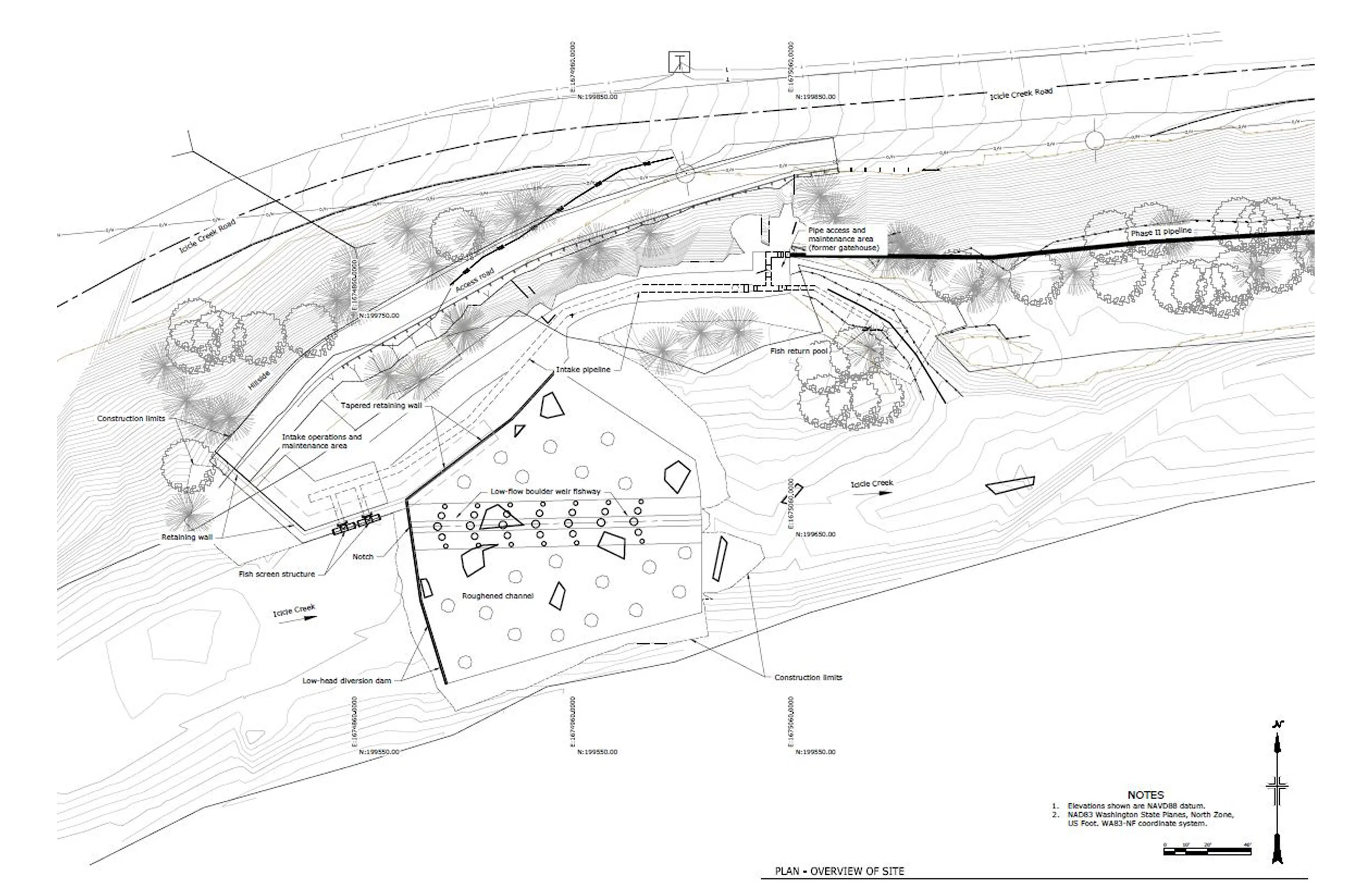 Engineered plan drawing of the LNFH SWISP Project Intake Area. The primary components displayed at the SWISP intake site include the access road, Intake Operations and Maintenance Area, fish screens, low-head diversion dam and notch, roughened channel, low-flow boulder weir fishway, intake pipeline, Pipeline Intake/Sluice Management Area (former gatehouse), and the fish return pool.