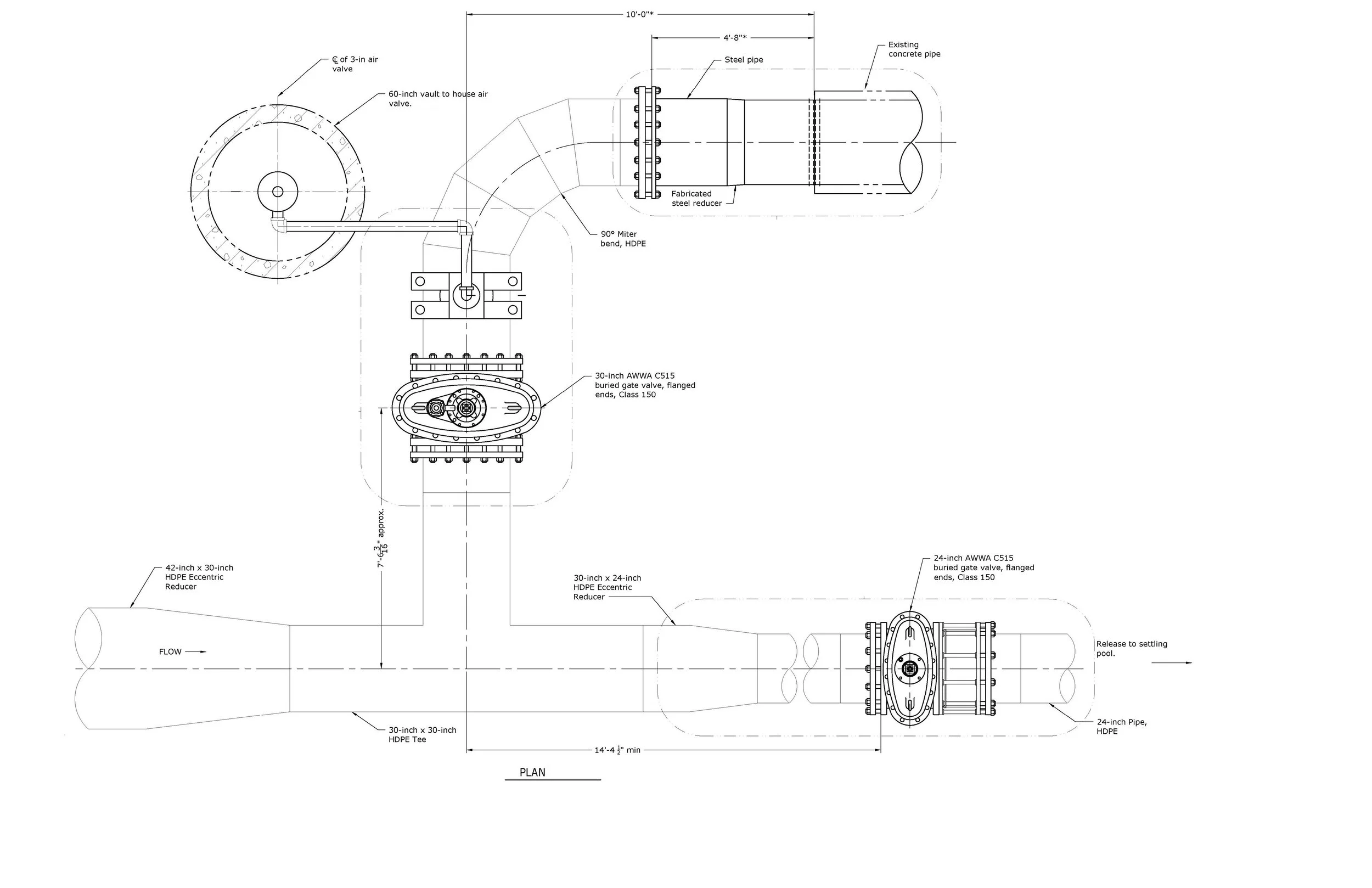 Construction of the headworks and roughened channel would incorporate the existing low-head diversion dam and intake channel. Self-cleaning, cylindrical fish screens would be installed at the diversion headworks, and a low-flow, boulder weir fishway would be integrated into the roughened channel. A new pipeline would be placed in the intake channel to connect the headworks to the conveyance pipeline. The intake channel would be filled to cover the pipeline and create the intake operations and maintenance area. The conveyance pipeline would be replaced on USFWS lands and lined with cure-in-place liner on private parcels. Construction of several manhole access points along the existing conveyance pipeline alignment would be installed to provide ingress and egress for pipe lining on private lands.