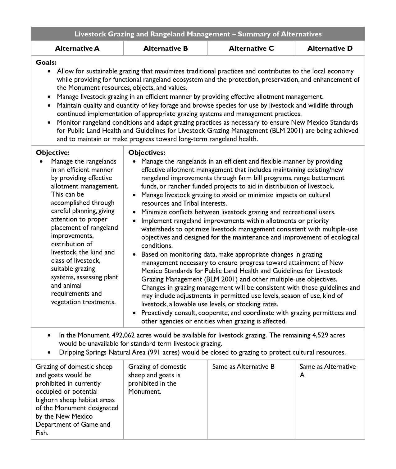 The BLM is proposing to manage livestock and rangeland areas to allow for sustainable grazing that maximizes traditional practices and contributes to the local economy while providing for functional rangeland ecosystem protection, preservation, and enhancement of the Monument resources, objects, and values.